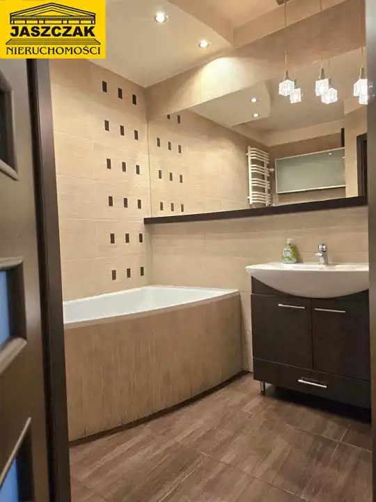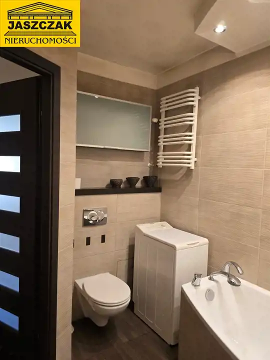 - komfortowa łazienka z wc (4,5) m2 nowe instalacje wodno-kanalizacyjne, wanna, sedes podwieszany, umywalka nablatowa, szafka wisząca, sufit częściowo podwieszany z oświetleniem ledowym, grzejnik rurkowy oraz nowe drzwi wraz z ościeżnicą.