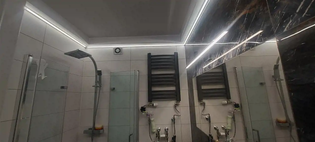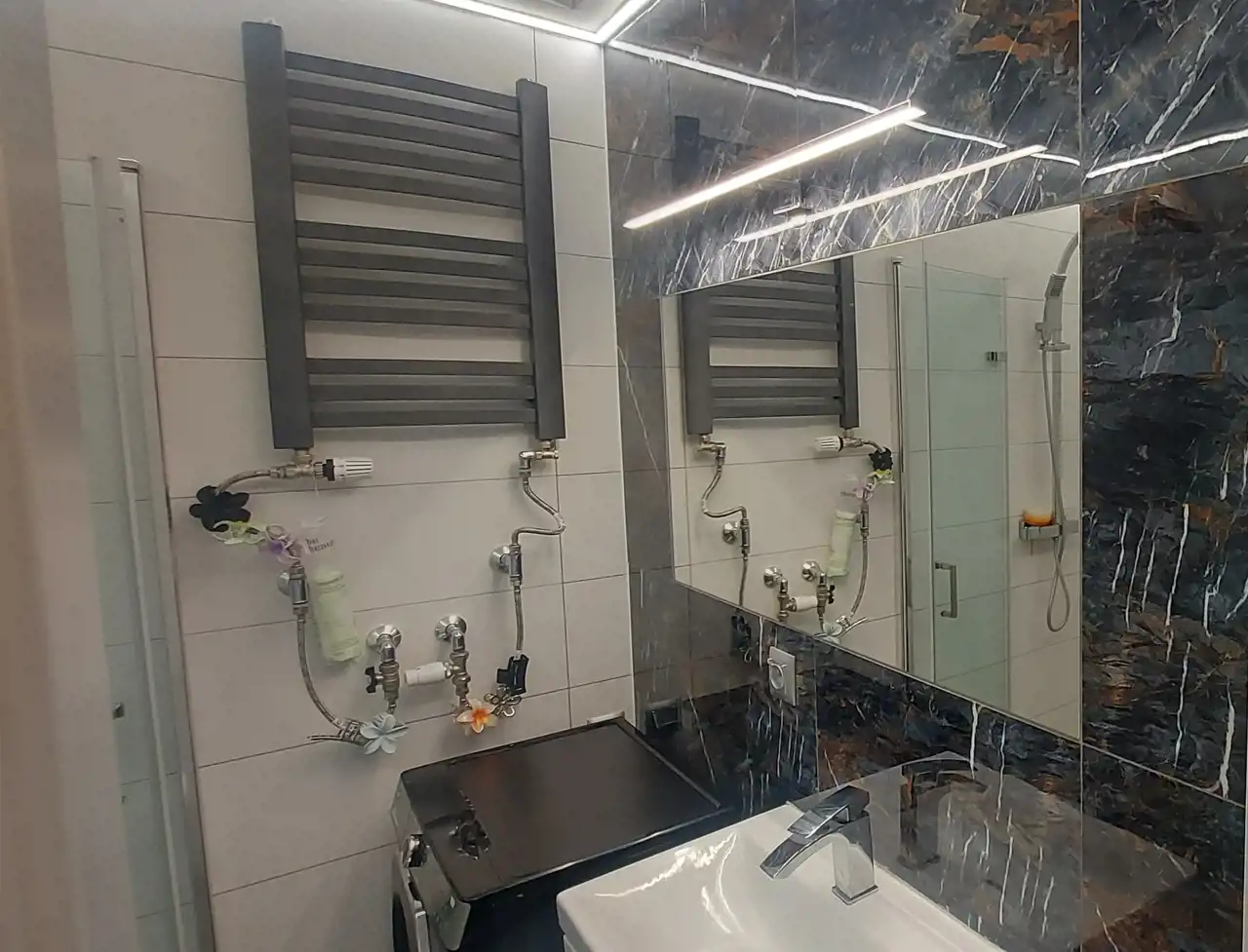– Łazienka z kabiną prysznicową – wykończona nowocześnie, z elegancką armaturą i miejscem na pralkę.