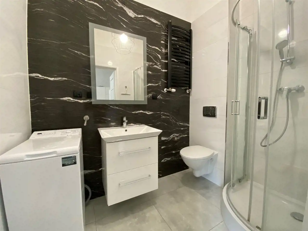 W łazience kompletny biały montaż, dodatkowo zostaje pralka.