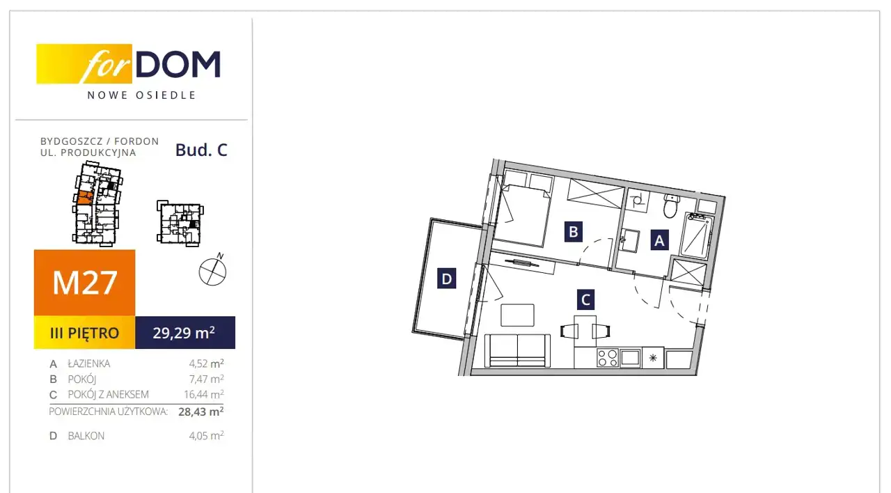 - Charakterystyka mieszkania 28.43 m2, 2 pokoje