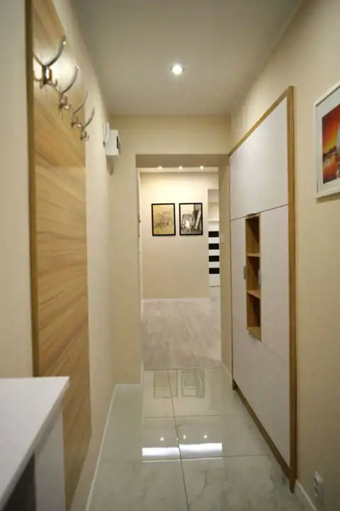 Wyposażenie wbudowane – szafa meblowa w przedpokoju, szafa odzieżowa typu Komandor (lustra) , elementy wbudowane zabudowy wnękowej. Meble kuchenne indywidualnie zaprojektowane pod wymiar z wbudowanym blatem i bufetem - wyposażenie stałe – płyta indukcyjna Wirpool, okap , zlewozmywak, miejsce na zmywarkę wbudowaną.