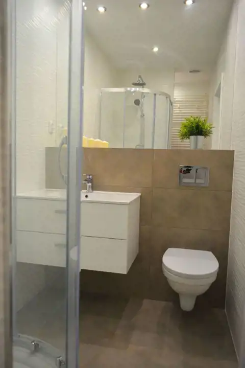 Ściany, zabudowy i sufity podwieszane system płyt gkf - gładź gipsowa, farby lateksowe zmywalne ISPO kolor . Podłogi – panele klasy IV i glazura gres poler 60x60cm; Łazienka: glazura firmy Paradyż ściany i podłoga, kompakt WC wiszący, umywalka z szafką, kabina natryskowa z panelem, wydzielona wnęka na pralkę i szafkę. Okna nowe PCV; drzwi przeszklone; zabezpieczenie: drzwi antywłamaniowe i domofon.