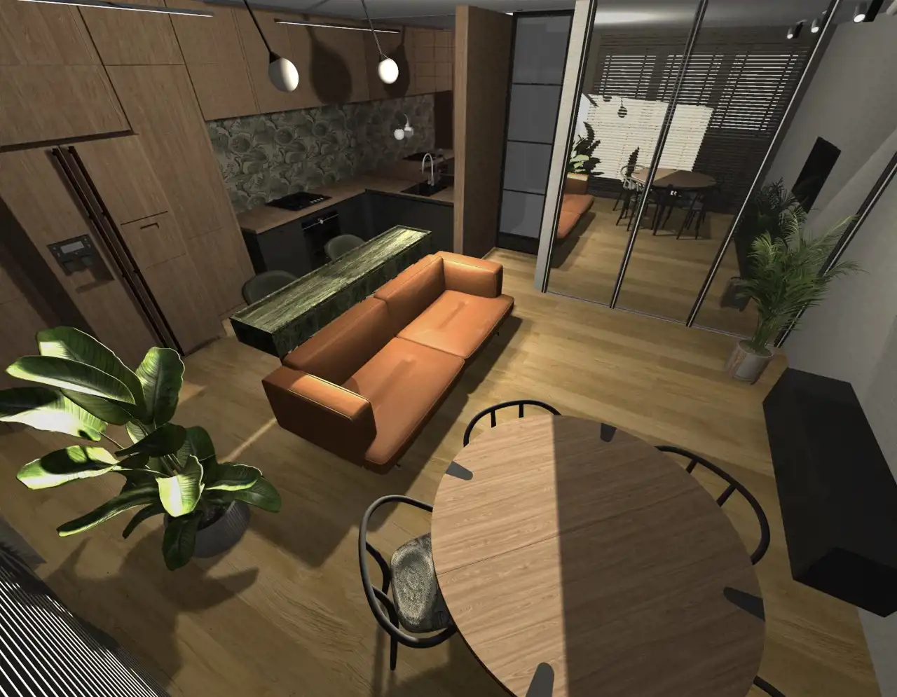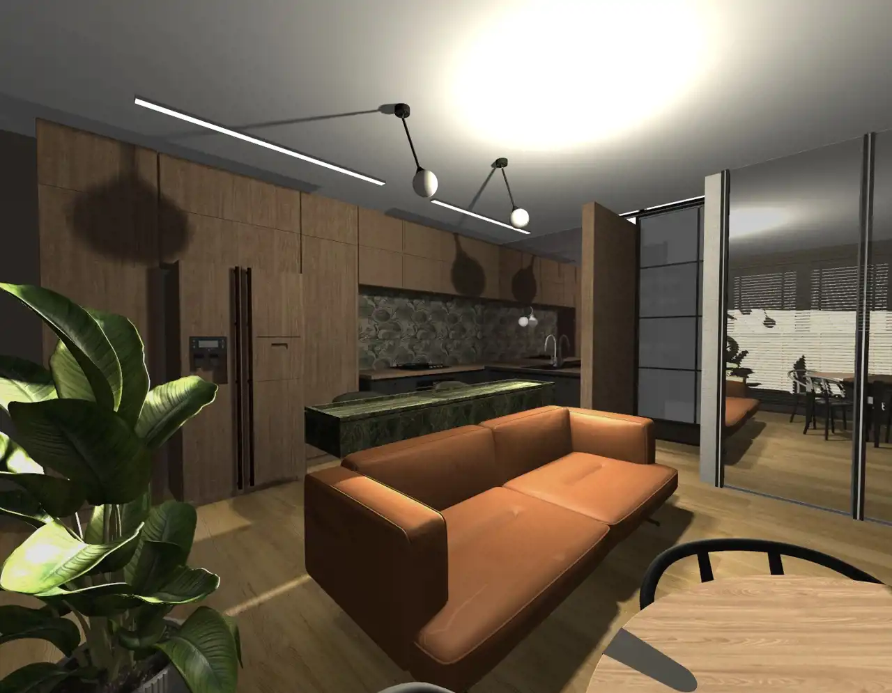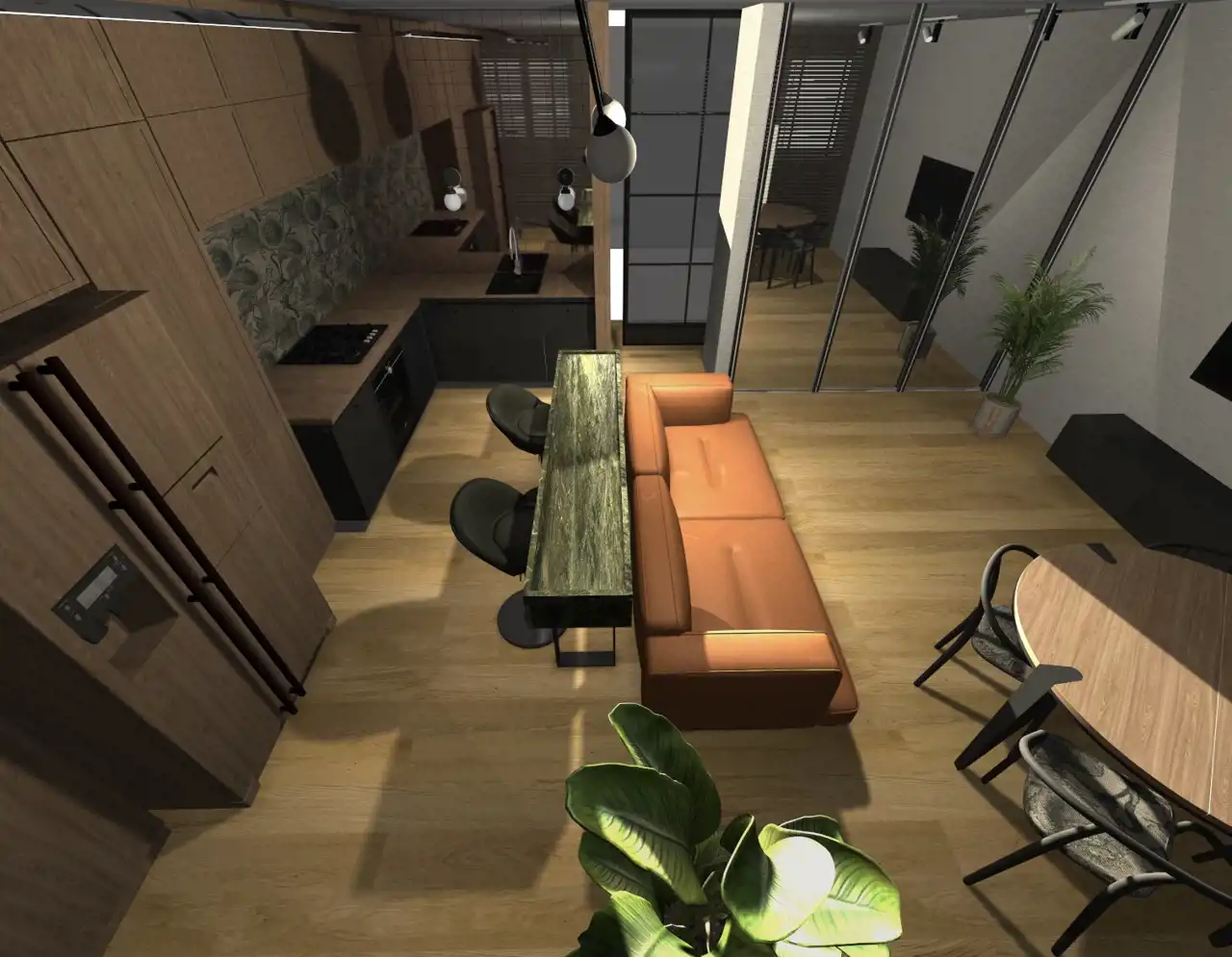 Istnieje możliwość połączenia większego pokoju z kuchnią i zaaranżowania salonu z aneksem kuchennym.