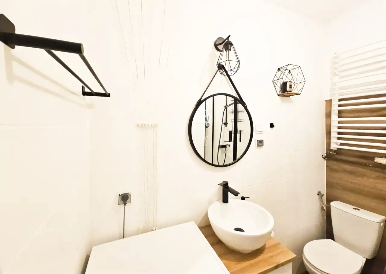Mieszkanie składa się z salonu z aneksem kuchennym, dużego pokoju, łazienki i przedpokoju.