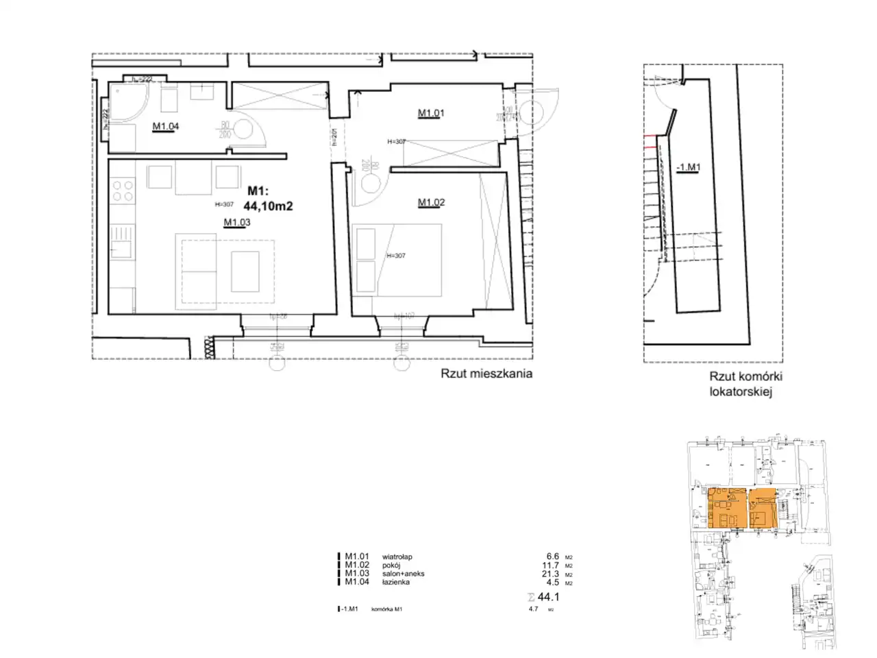 - Charakterystyka mieszkania 44.1 m2, 2 pokoje