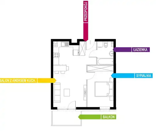 - Charakterystyka mieszkania 43.84 m2, 2 pokoje