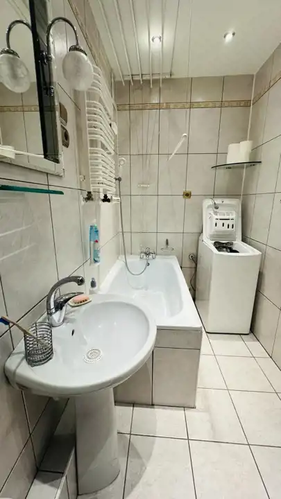 Łazienka razem z WC wyposażona jest w wannę i pralkę. Mieszkanie posiada także balkon oraz przestronną piwnicę lokatorską o wymiarach 2 na 2m .