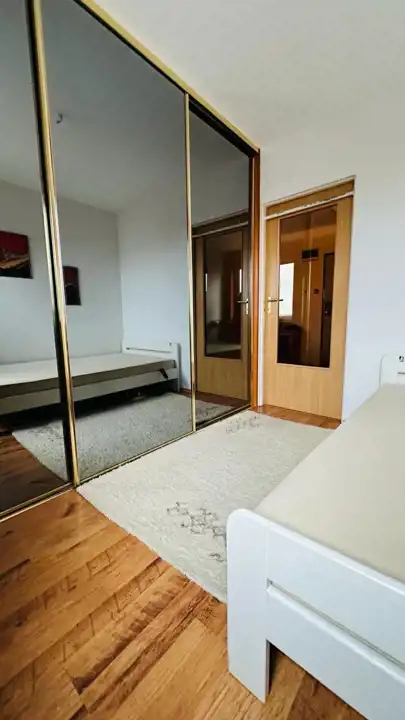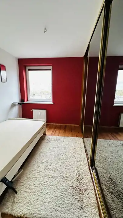 Sypialnia o pow.8m charakteryzuje się praktyczną,estetyczną szafą na całej długość ściany. Szafa ta ,wyposażona jest w lustra sięgające do sufitu co optycznie powiększa przestrzeń W sypialni znajduje się łóżko jednoosobowe na pliota