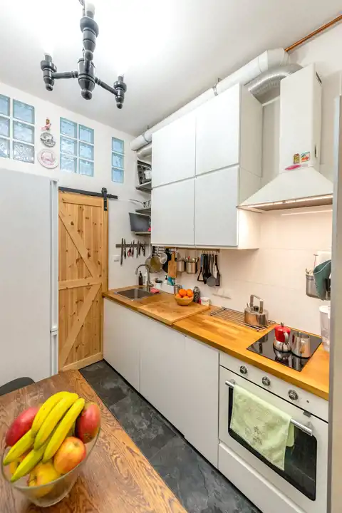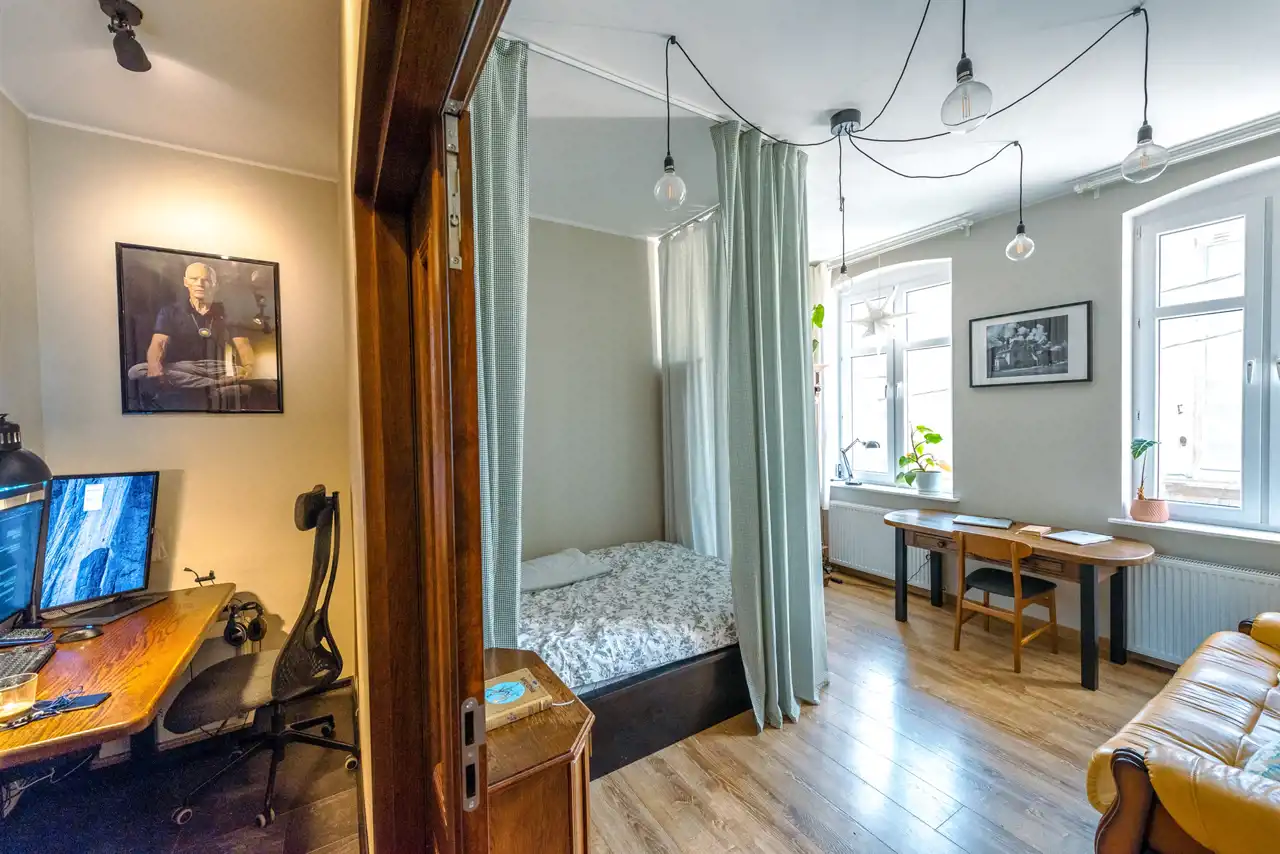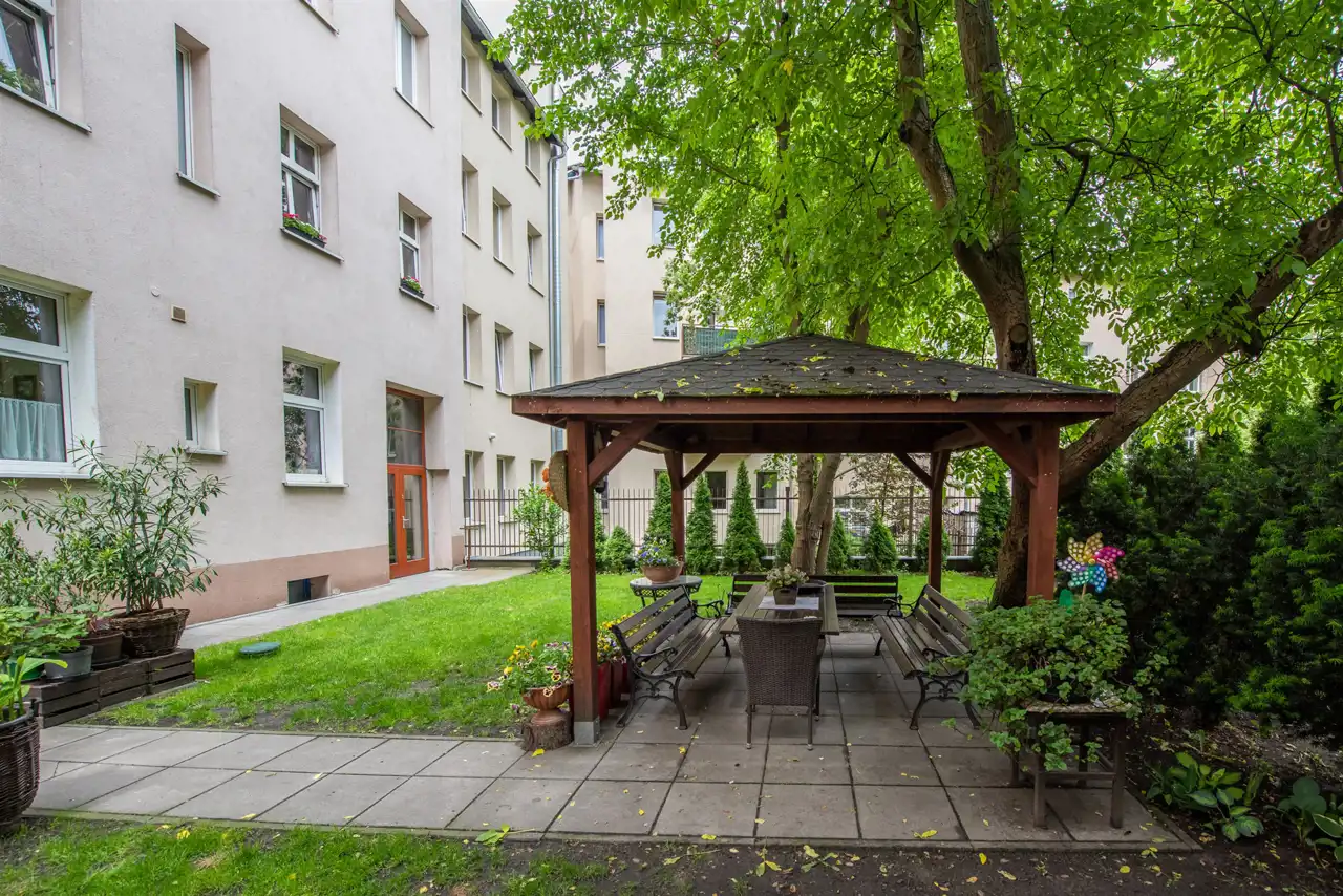 Wnętrze mieszkania zaskakuje przestronnością. Składa się z dwóch bardzo dużych pokoi, jasnej kuchni z nowoczesną zabudową oraz łazienki z oknem. Wysokość pomieszczeń sięga 3 metrów, co sprawia, że przestrzeń wydaje się jeszcze większa i bardziej otwarta. Duże okna wpuszczają mnóstwo światła, tworząc przyjazny, ciepły klimat. Dodatkowym atutem jest ogródek, z którego mogą korzystać wyłącznie mieszkańcy – idealne miejsce na poranną kawę lub chwilę relaksu na świeżym powietrzu. Mieszkanie nie posiada balkonu, ale ta przestrzeń na zewnątrz doskonale go zastępuje.