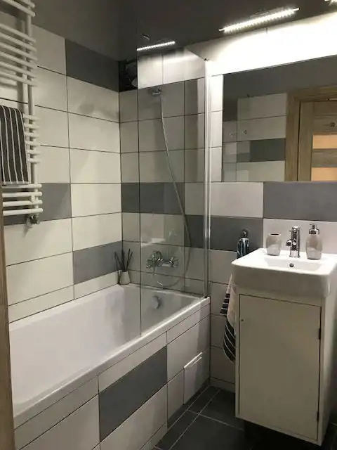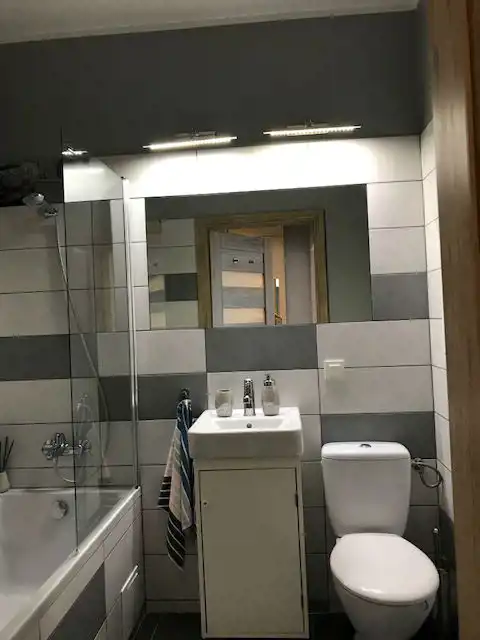 ŁAZIENKA Z WC - pralka, wanna z funkcją natrysku, zabudowa boczna przeszklona, szafka pod zlewem, lustro z oświetleniem, glazura i terakota.