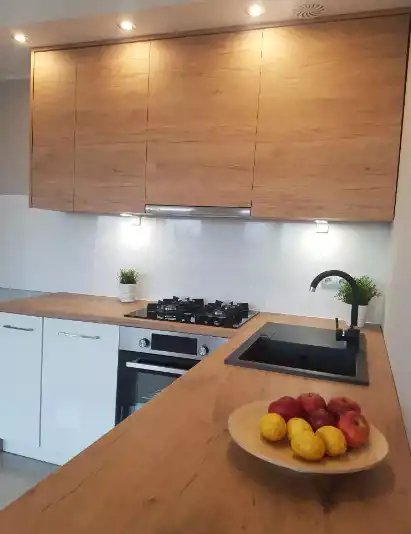 Zabudowa kuchenna, robiona na zamówienie przez stolarza, wyposażona zostanie w nowe sprzęty AGD: piekarnik, zmywarkę, płytę gazową, okap na filtr węglowy oraz zlew.