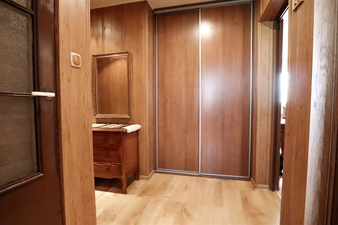 Przedpokój został wyposażony w funkcjonalnie zabudowaną szafę, co pozwala na przechowywanie wszystkich okryć wierzchnich w jednym miejscu.