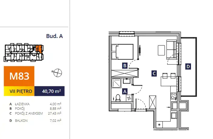- Charakterystyka mieszkania 40.7 m2, 2 pokoje