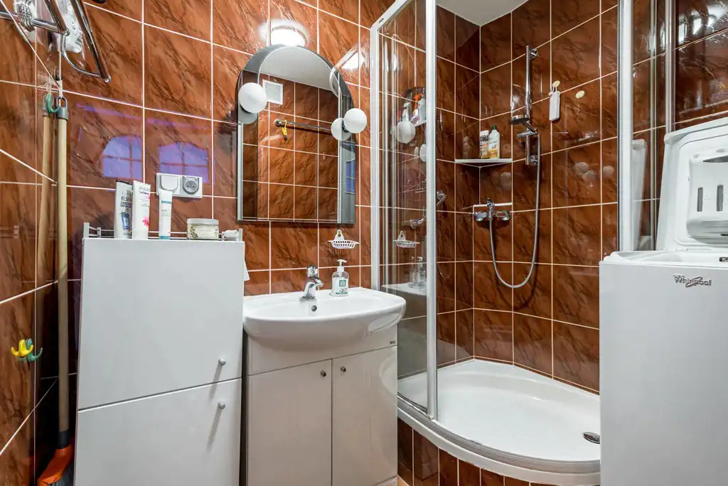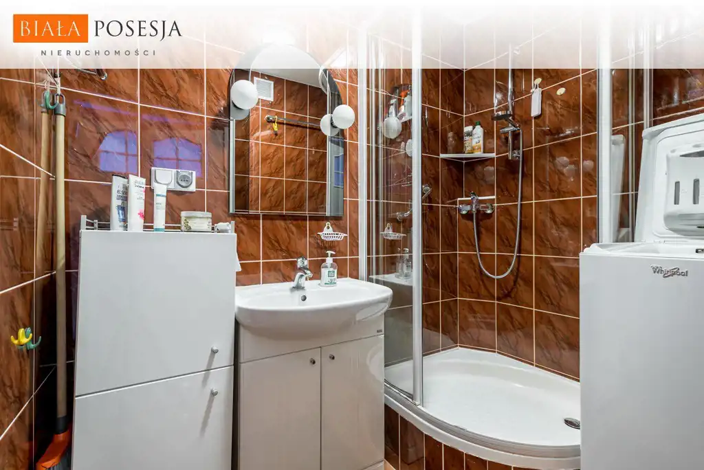 - łazienka z prysznicem i pralką,