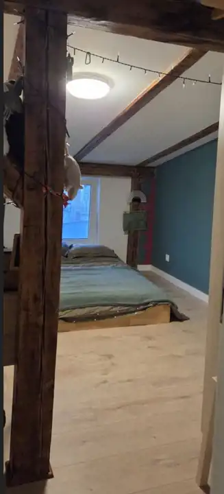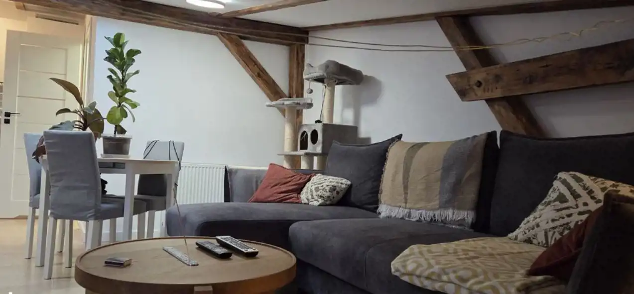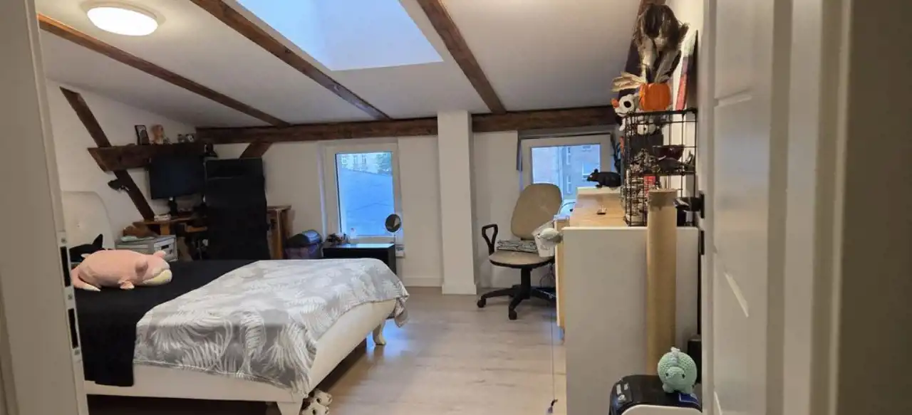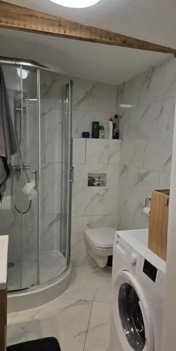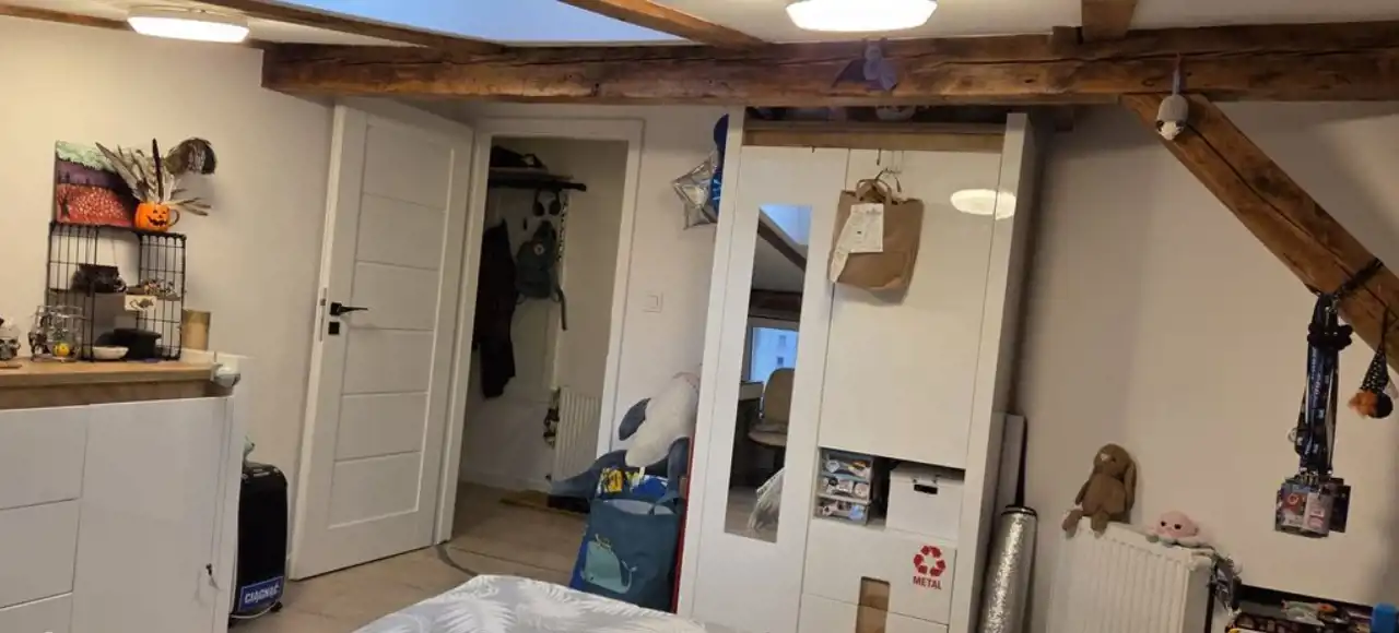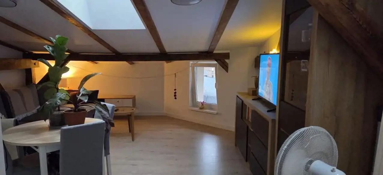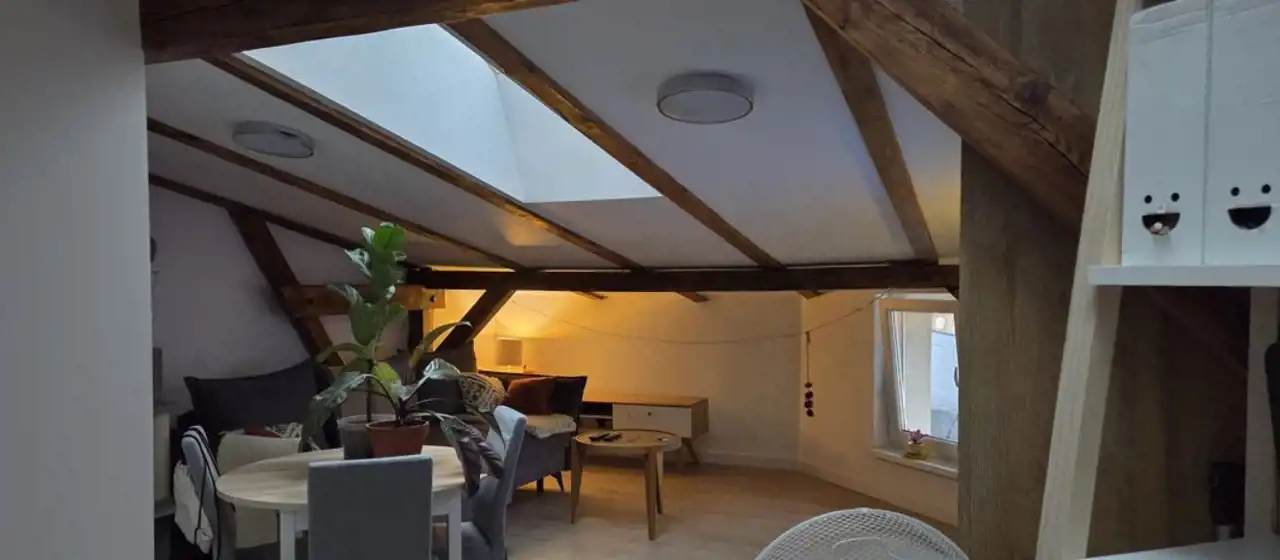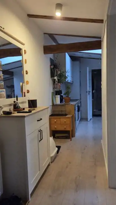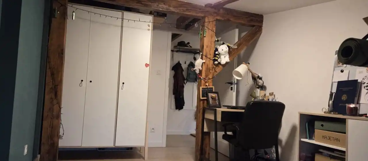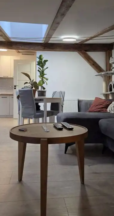 Mieszkanie znajduje się na poddaszu. Wysokość mieszkania do skosów wynosi 2,20 m. Powierzchnia użytkowa, bez tej pod skosami wynosi 38,3 m2.