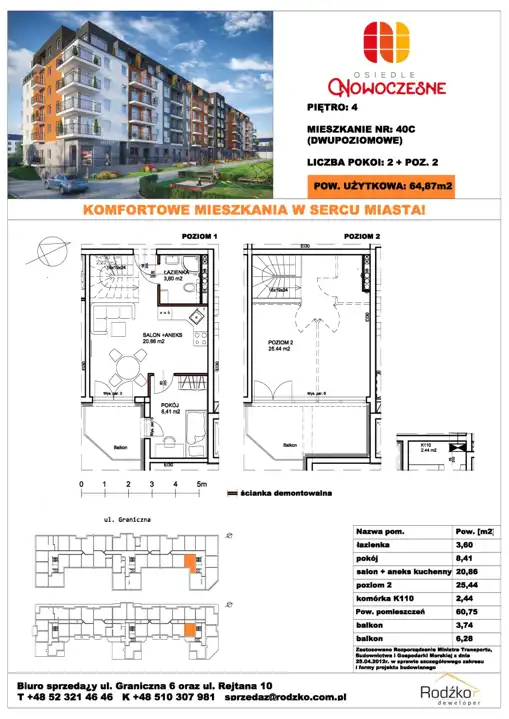 - Charakterystyka mieszkania 64.87 m2, 3 pokoje