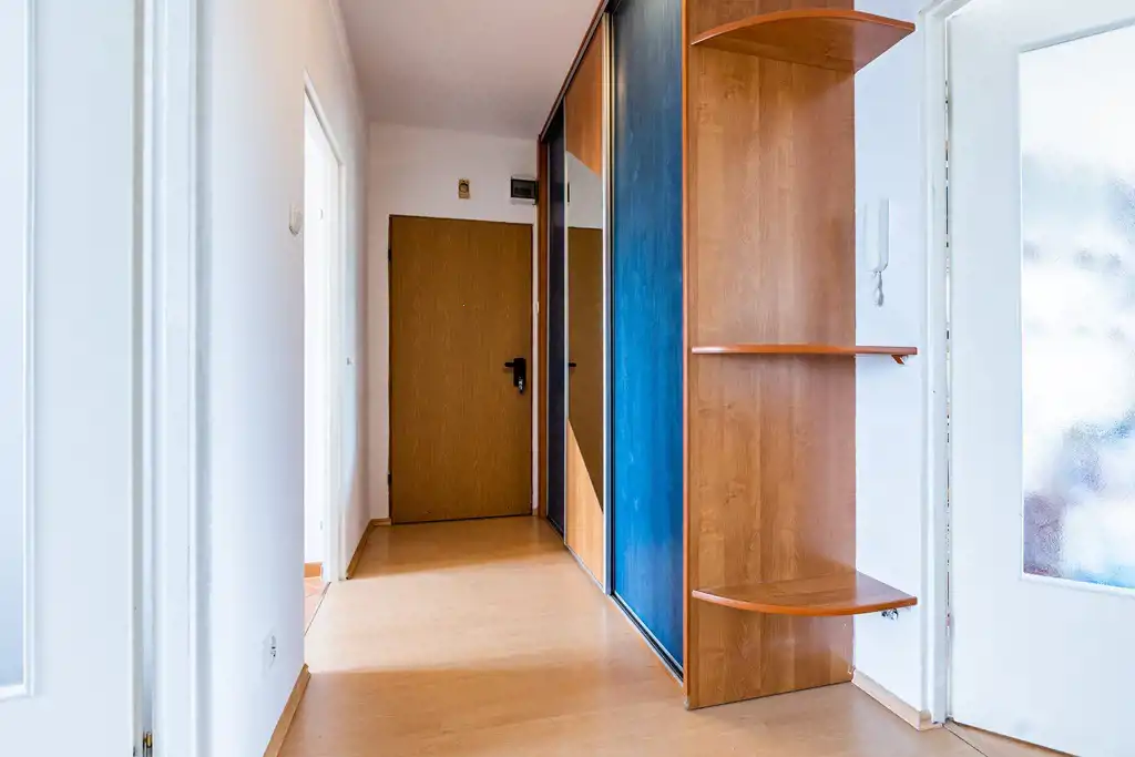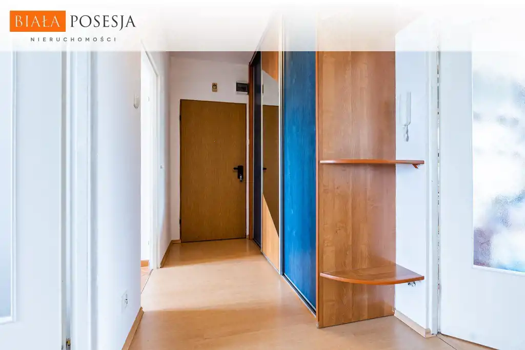 W skład mieszkania wchodzą dwa pokoje – przestronny salon (22 m2) z wyjściem na balkon typu loggia oraz mniejszy pokój (ok. 12 m2), osobna kuchnia (8 m2), łazienka z toaletą, przedpokój.