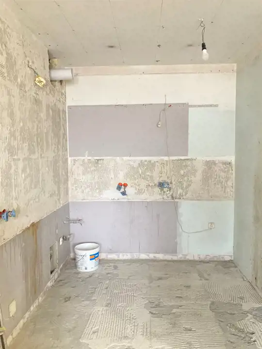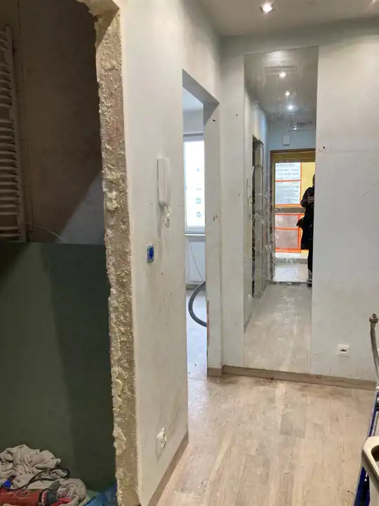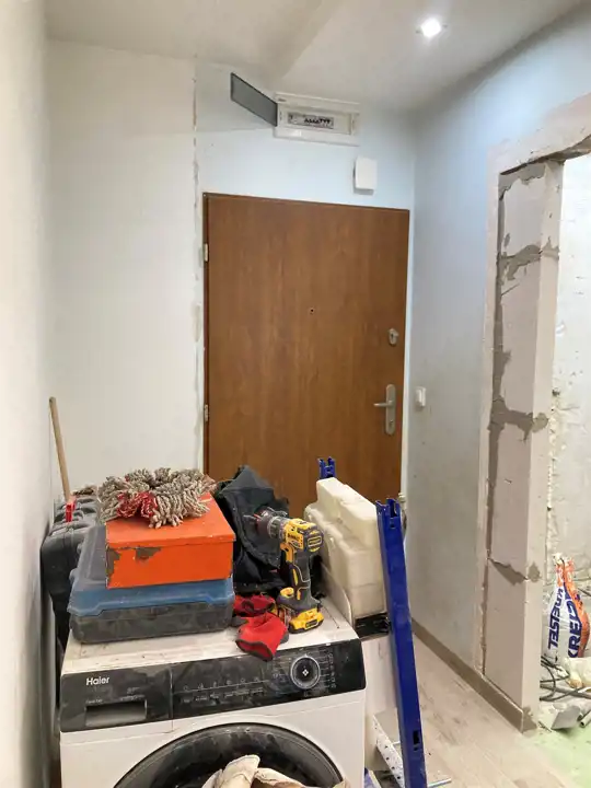 W mieszkaniu obecnie właściciel rozpoczął kapitalny remont - brak aneksu kuchennego, łazienka przygotowana pod płytki. W korytarzu, i pokojach na podłodze jest płytka drewnopodobna, okna pcv.
