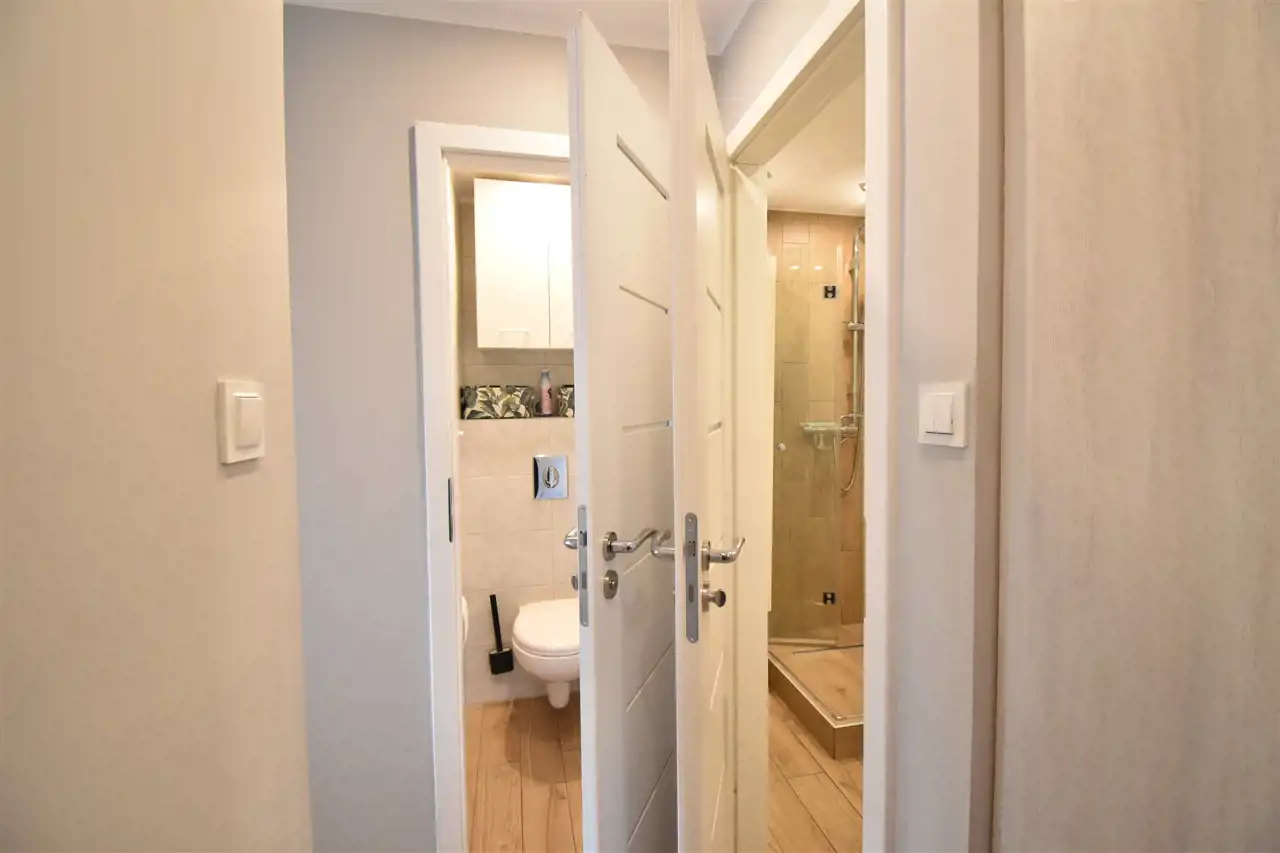 Łazienka i toaleta wykonana w jasnych barwach dających przestrzeń.