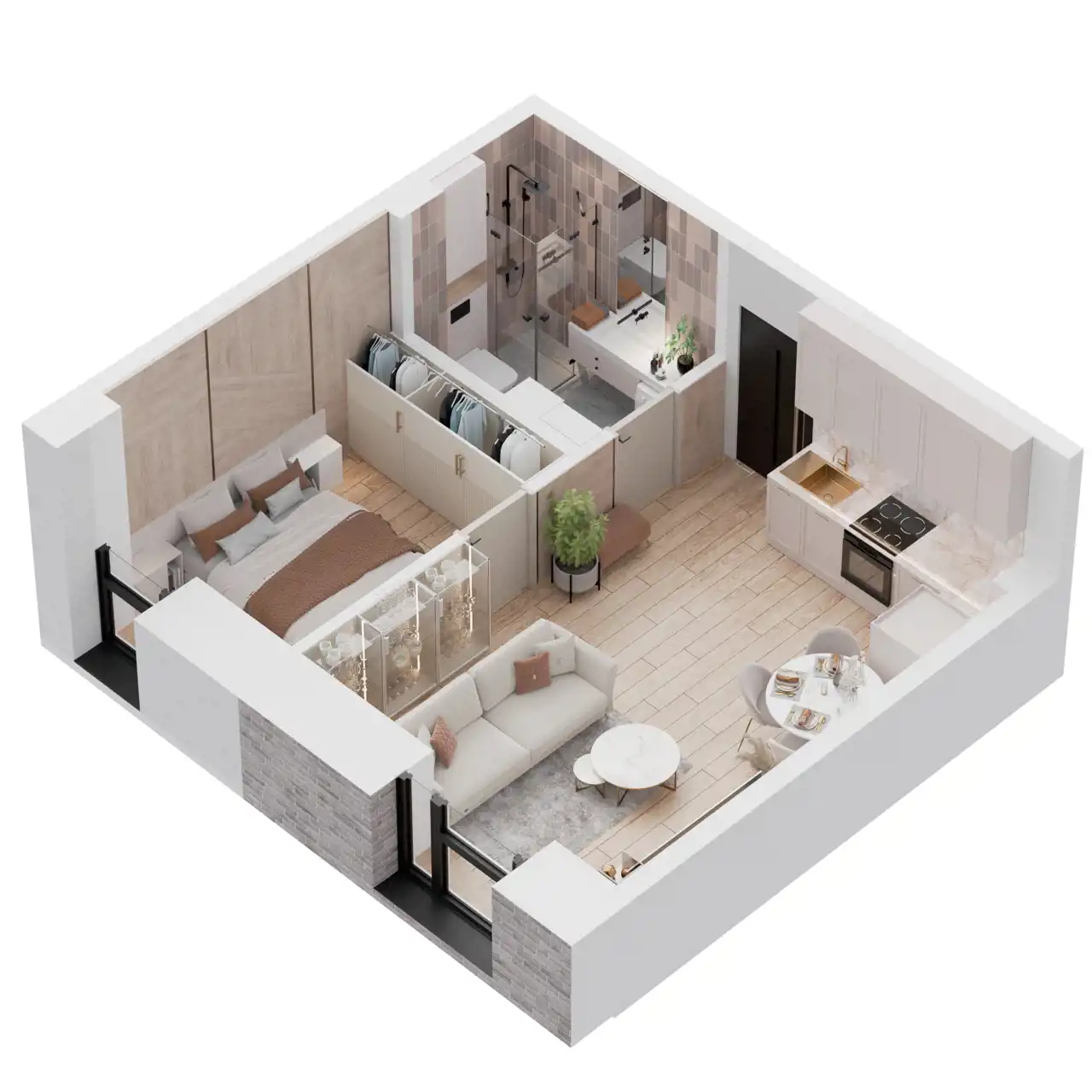 - Charakterystyka mieszkania 33.57 m2, 2 pokoje