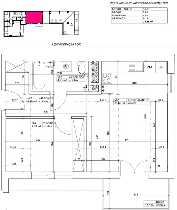 - Charakterystyka mieszkania 35.38 m2, 2 pokoje