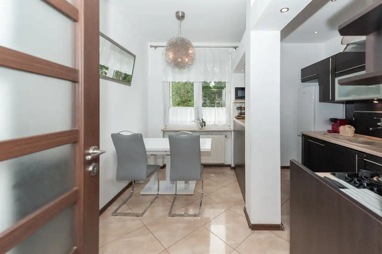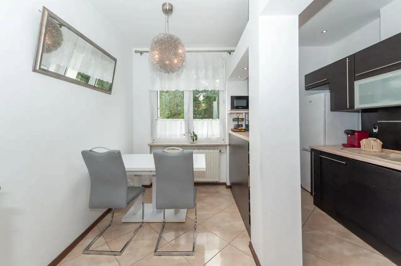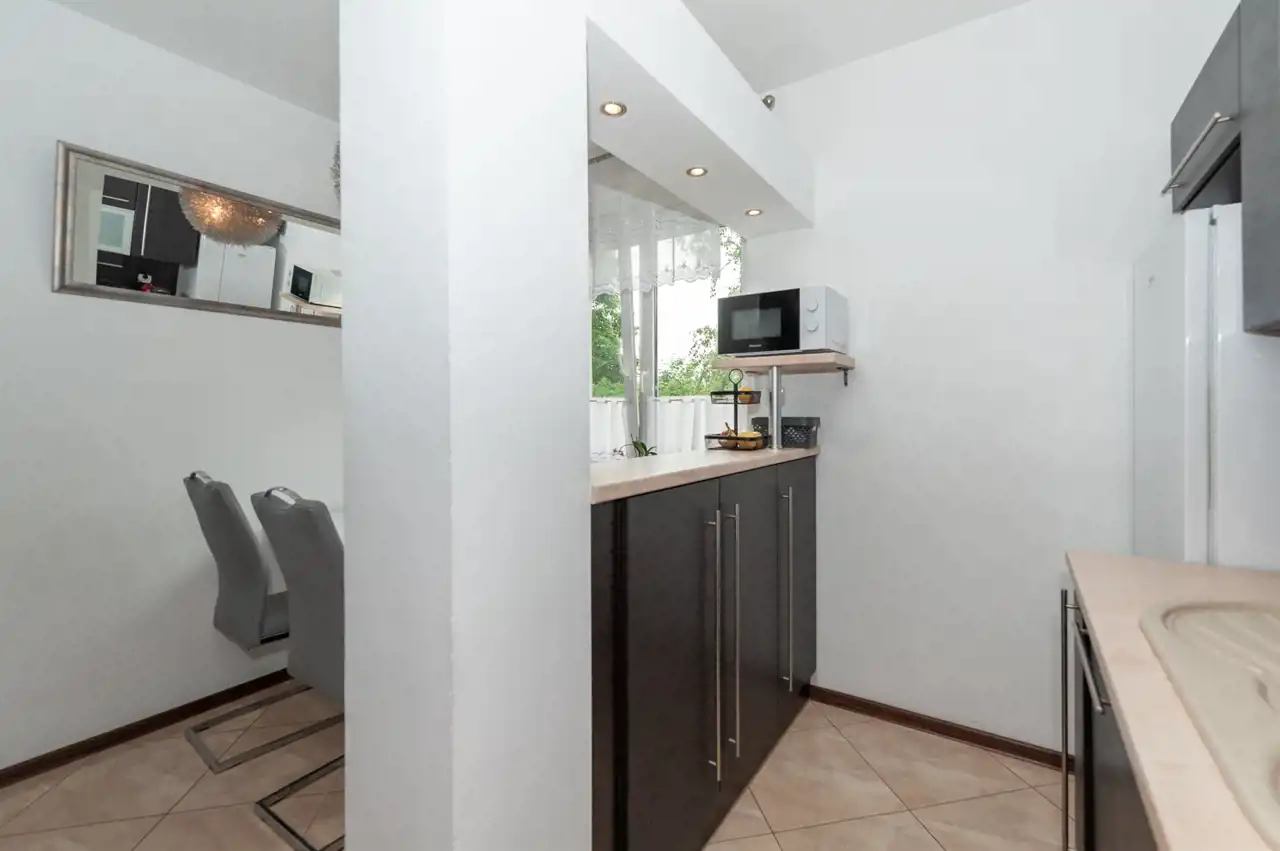 Wnętrze nie wymaga dodatkowych nakładów finansowych. Na podłodze sypialni położone praktyczne panele, natomiast w kuchni estetyczne kafle. Kuchnia przypadnie do gustu każdemu, kto lubi gotować ze względu na sporo miejsca do pracy i przechowywania.