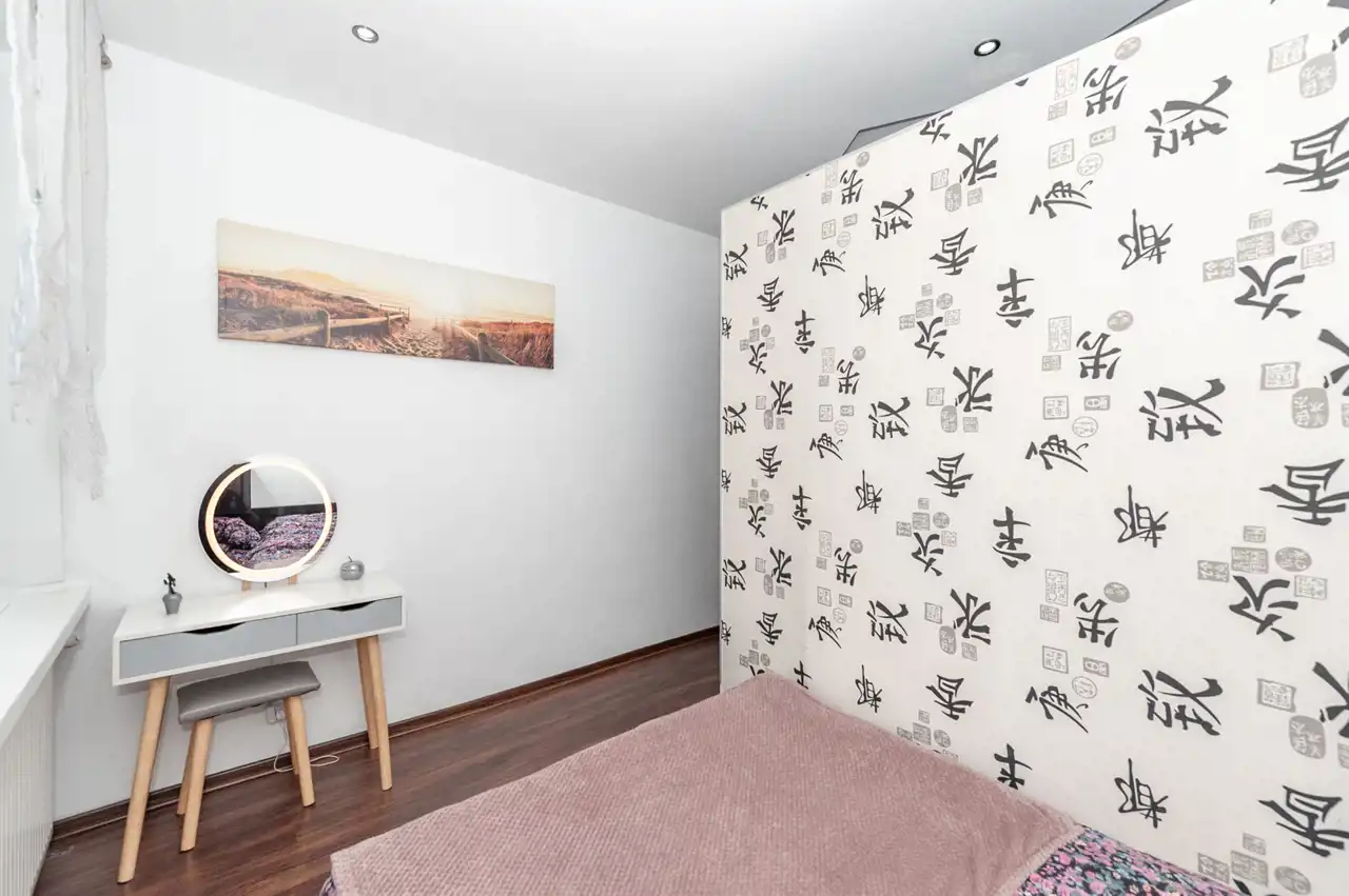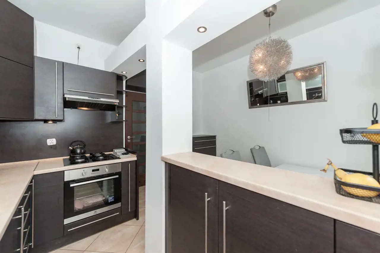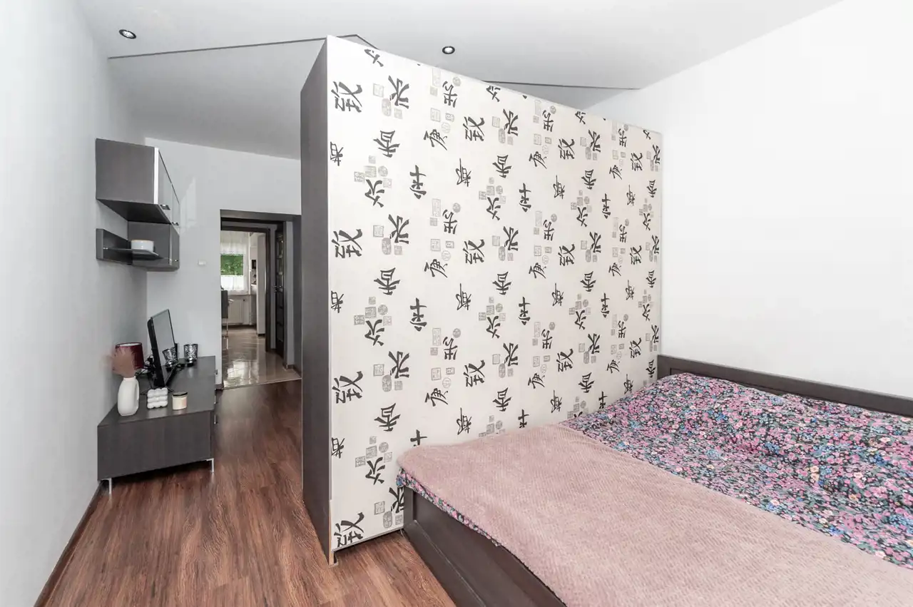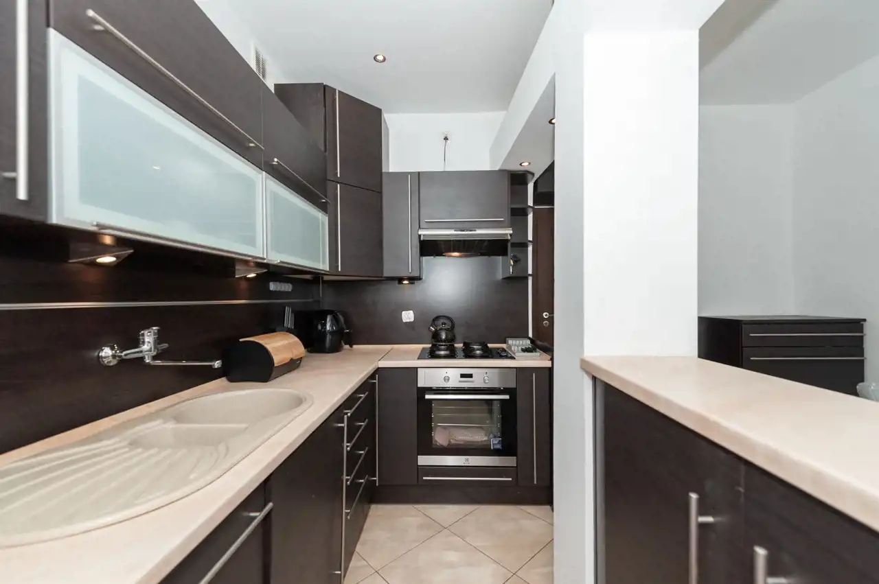 Wnętrze nie wymaga dodatkowych nakładów finansowych. Na podłodze sypialni położone praktyczne panele, natomiast w kuchni estetyczne kafle. Kuchnia przypadnie do gustu każdemu, kto lubi gotować ze względu na sporo miejsca do pracy i przechowywania.