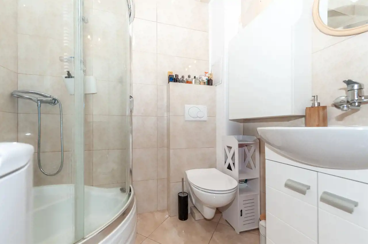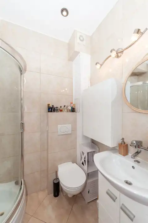 Łazienka z toaletą, została wyposażona w prysznic. Czynsz administracyjny 563zł. Forma własności odrębna własność z KW. Atutem jest usytuowanie salonu od spokojnej zielonej strony.