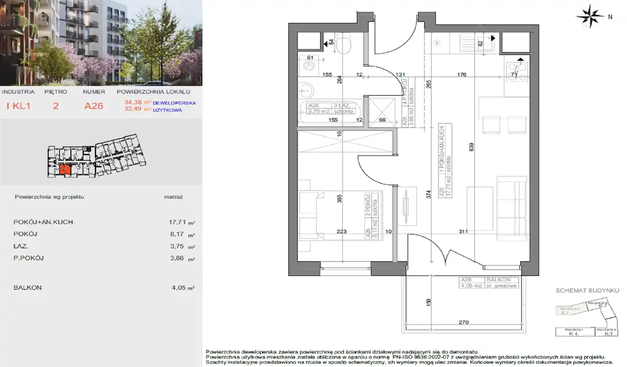 - Charakterystyka mieszkania 33.49 m2, 2 pokoje