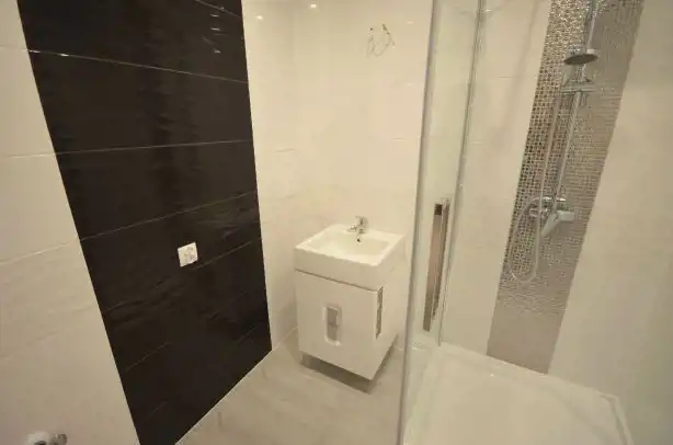 Łazienka z kabiną prysznicową, glazura i terakota.