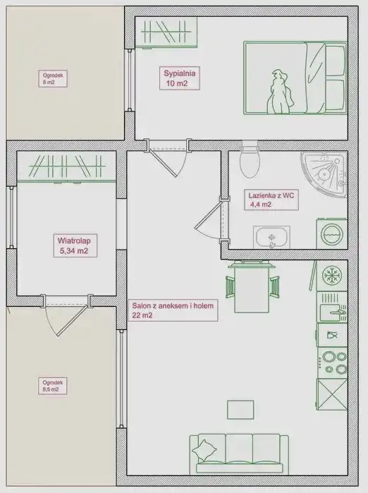 - dwóch prywatnych ogródków – na wejściu 8,5 m² oraz w sąsiedztwie sypialni 5 m²,