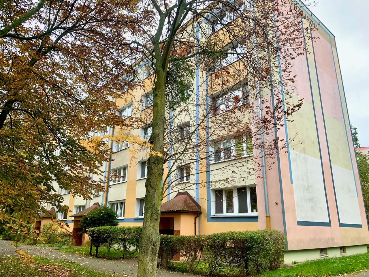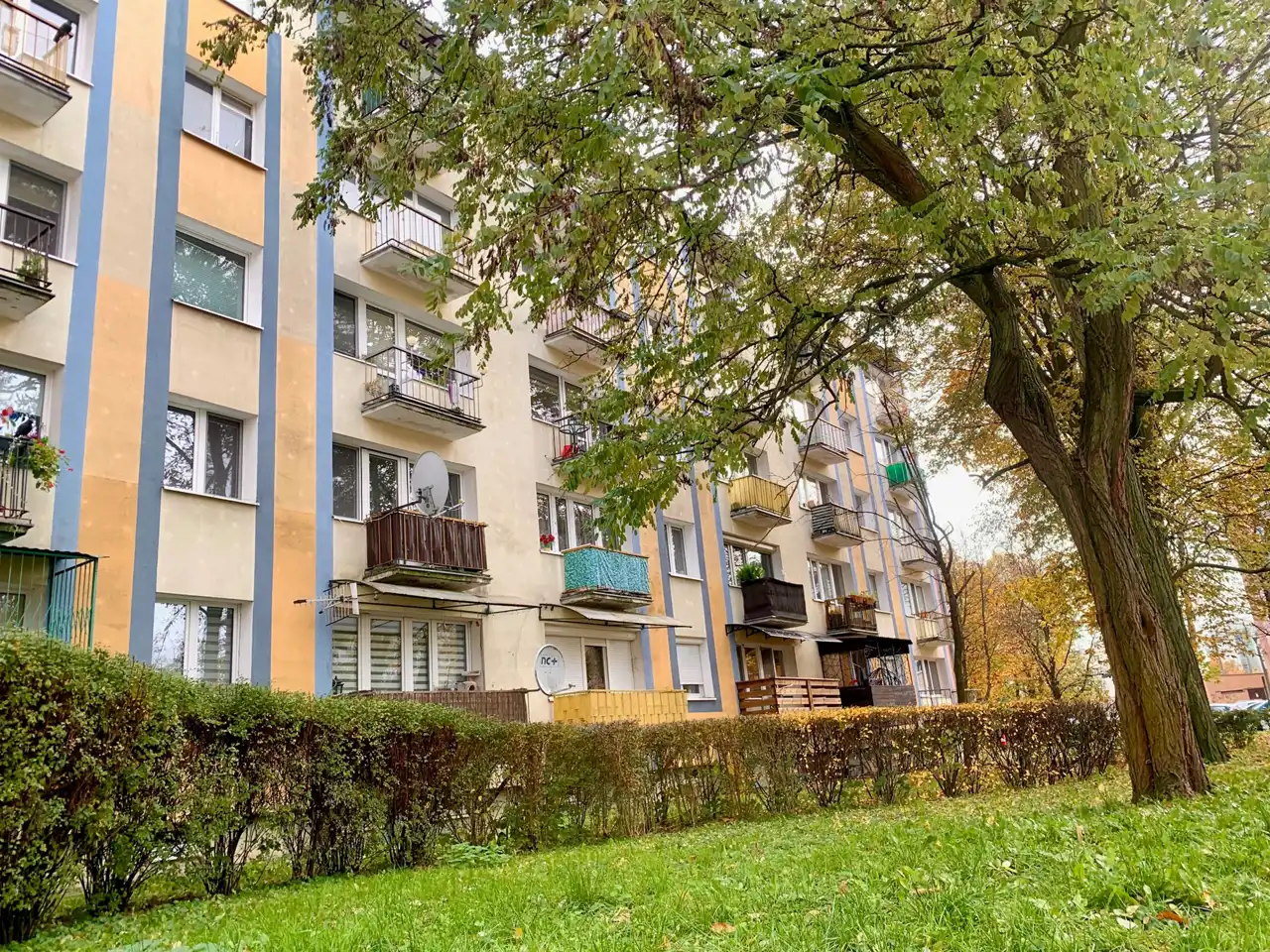 Budynek: czteropiętrowy blok, zadbane otoczenie, dużo zieleni i miejsc parkingowych.