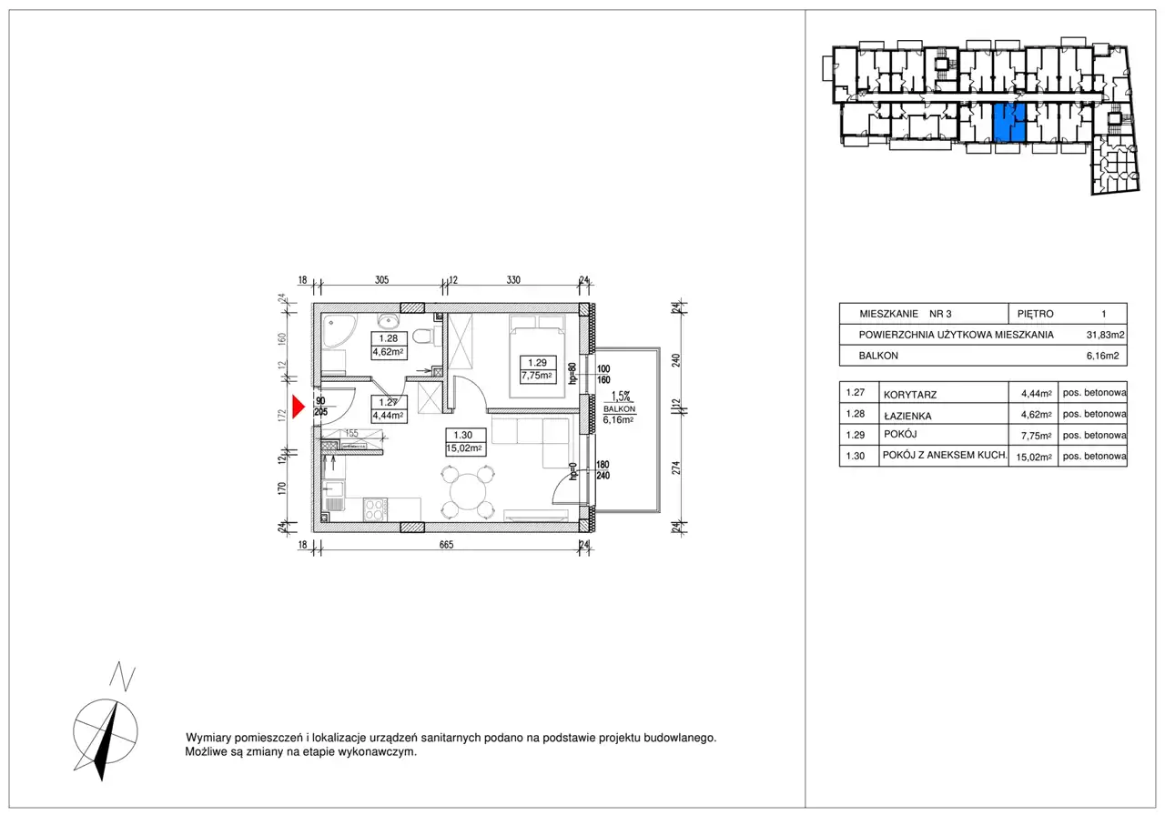 - Charakterystyka mieszkania 31.83 m2, 2 pokoje