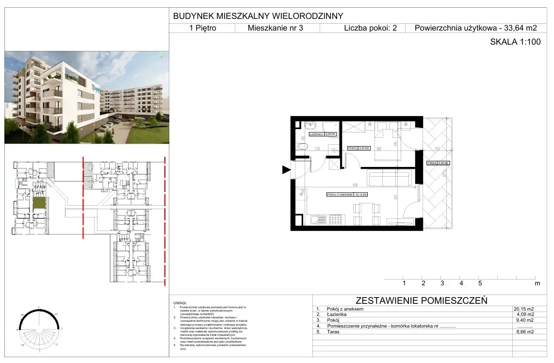 - Charakterystyka mieszkania 33.64 m2, 2 pokoje