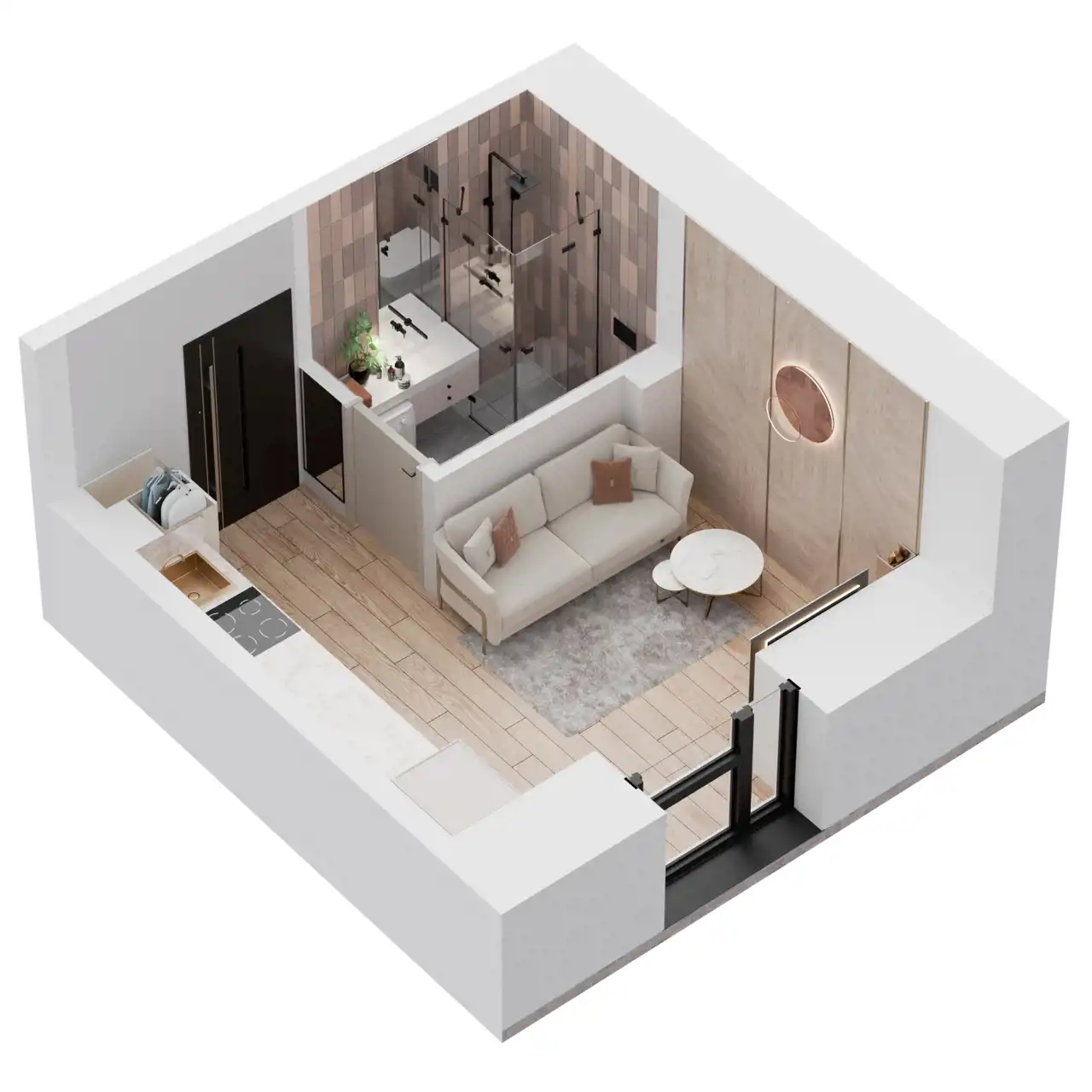 - Charakterystyka mieszkania 34.94 m2, 2 pokoje