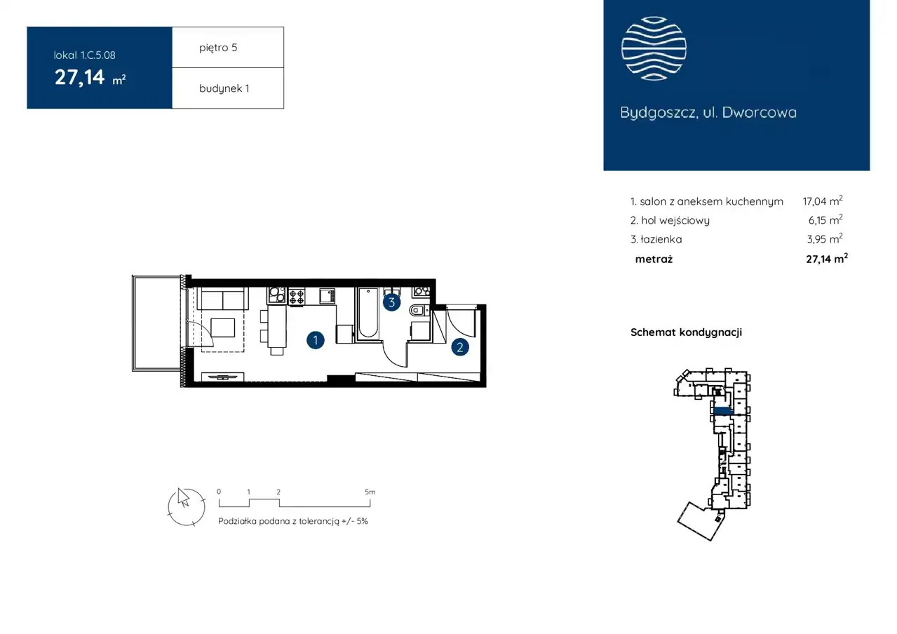 Prezentowane mieszkanie o powierzchni 27,14 m2 składa się z: