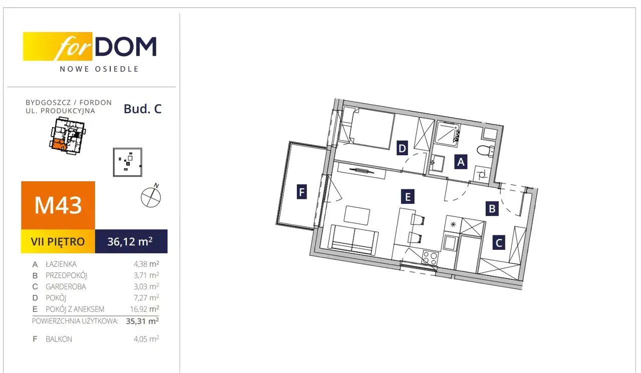 - Charakterystyka mieszkania 36.12 m2, 2 pokoje