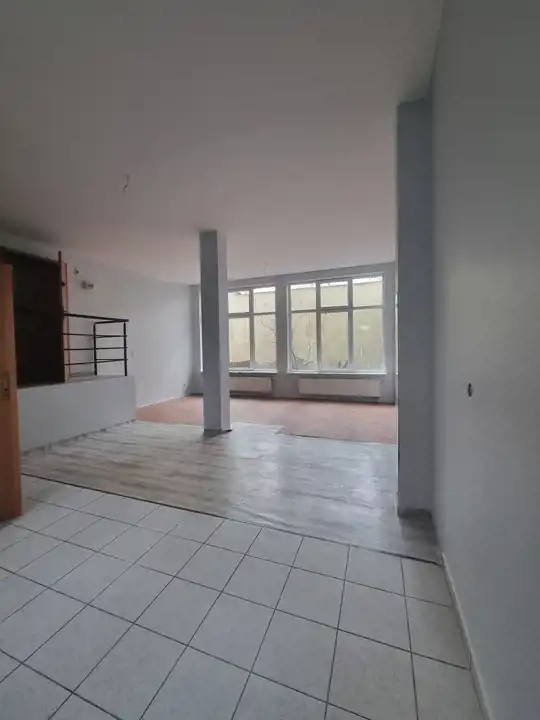Przestrzeń jest częściowo odświeżona — jasne ściany i podział podłóg pozwalają na stworzenie wygodnych stref funkcjonalnych.