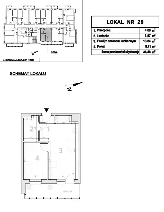 - Charakterystyka mieszkania 36.48 m2, 2 pokoje