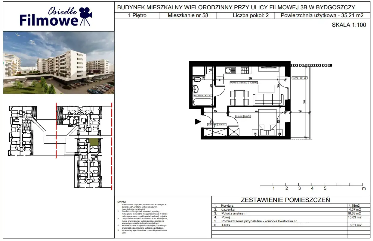 Oferta dotyczy mieszkania znajdującego się w budynku przy ul. Filmowej 3B. W całym obiekcie znajduje się łącznie 114 mieszkań.