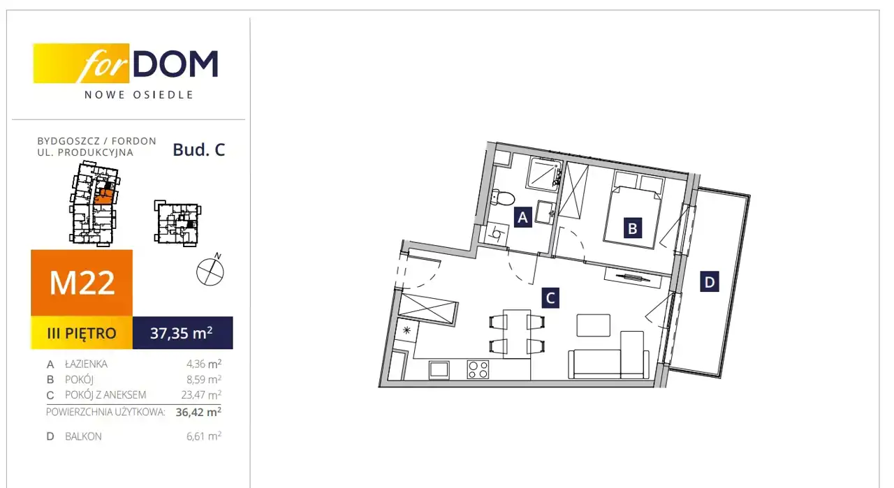 - Charakterystyka mieszkania 36.44 m2, 2 pokoje