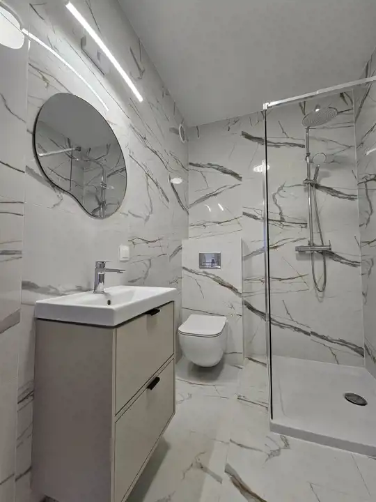 łazienka - kabina prysznicowa, wc, umywalka z szafką podwieszaną, lustro, oświetlenie