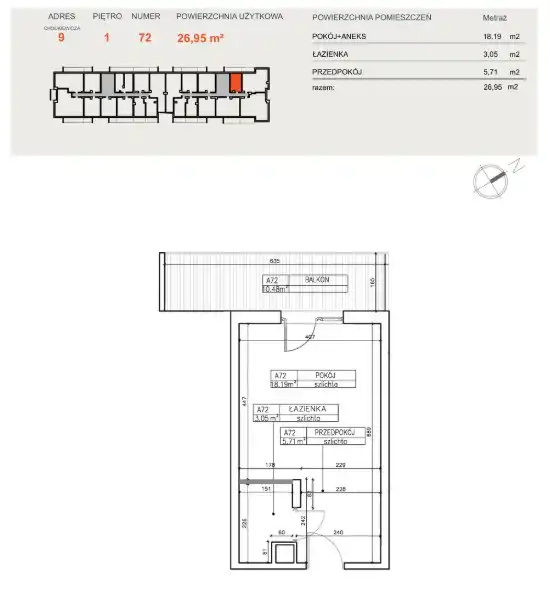 Mieszkanie o powierzchni 26,95 m2 składa się z: