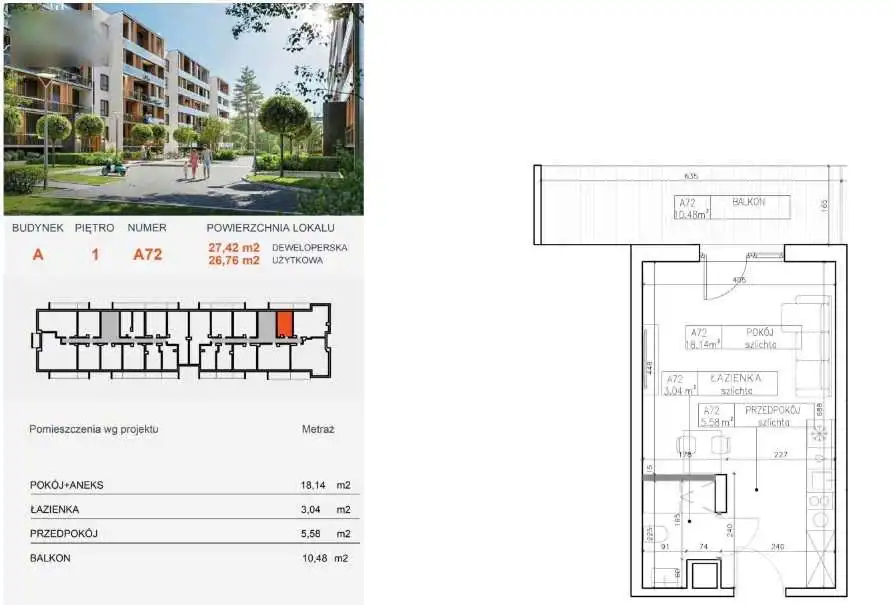 Przedstawiamy 1 pokojowe mieszkanie o powierzchni 26,76 m2 na 1 piętrze w bloku z cichą windą.