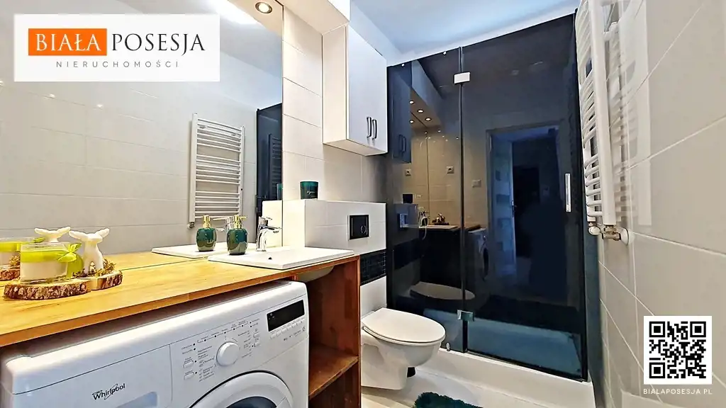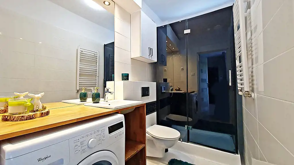 - łazienka 4,82 m2 - wyposażona w duży prysznic z hydromasażem, umywalkę wpuszczaną w drewniany blat, duże wklejane lustro, podwieszaną miską WC, oraz pralkę Whirlpool;