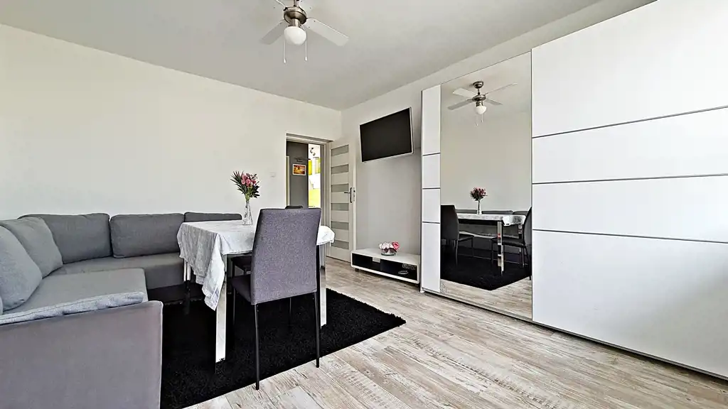 - salon 18,6 m2 - z dużym narożnikiem z funkcją spania, telewizorem, pojemną szafą, stołem z krzesłami, oraz balkonem z widokiem na zachód słońca