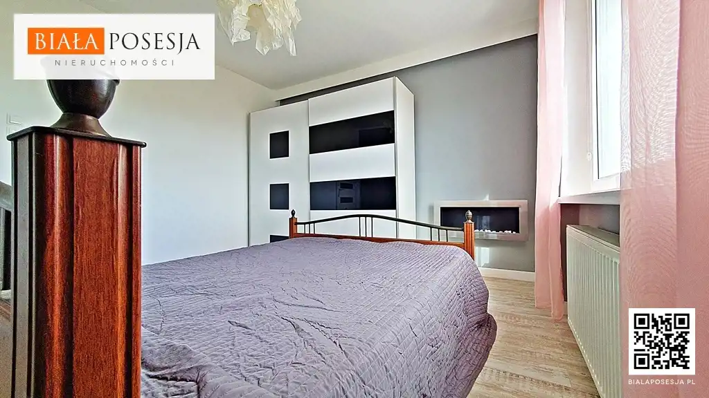 - sypialnia 14,6 m2 - z pojemną szafą, dużym łóżkiem z widokiem na kominek i wschód słońca za oknem