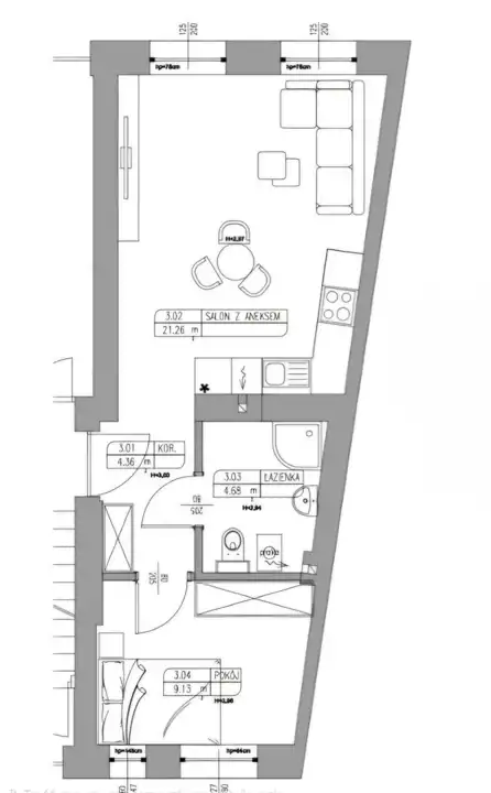- jasnego pokoju dziennego z aneksem kuchennym o pow. 21,26m2
