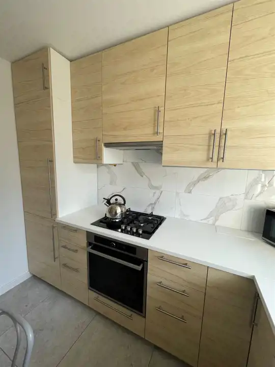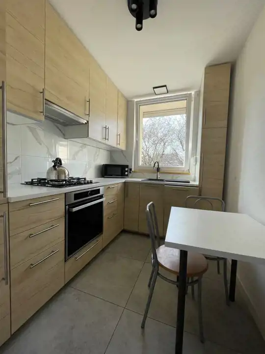 Piękna nowoczesna zabudowa kuchenna, ustawne pokoje, łazienka która pomieściła pralkę oraz balkon z widokiem na zieleń w przyblokowym ogrodzie.