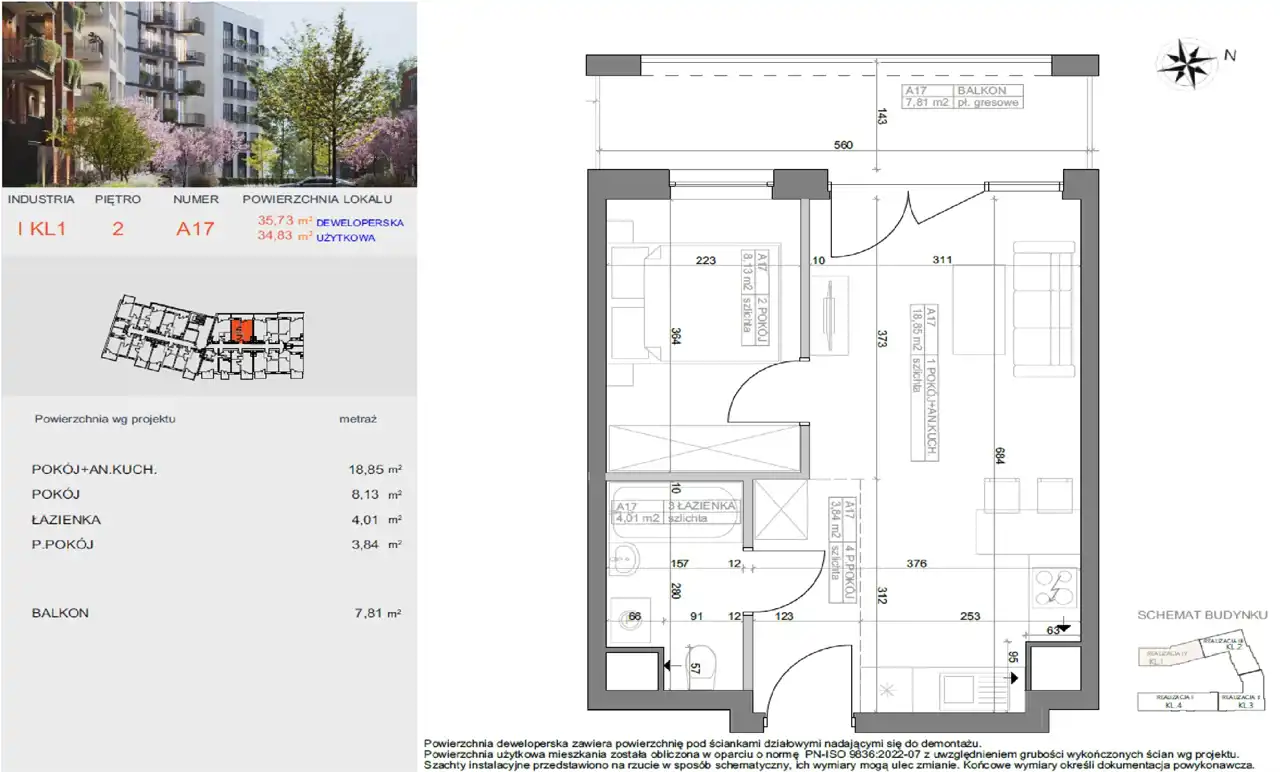 Mieszkanie o powierzchni 34,83 m2 składa się z:- salonu z aneksem kuchennym